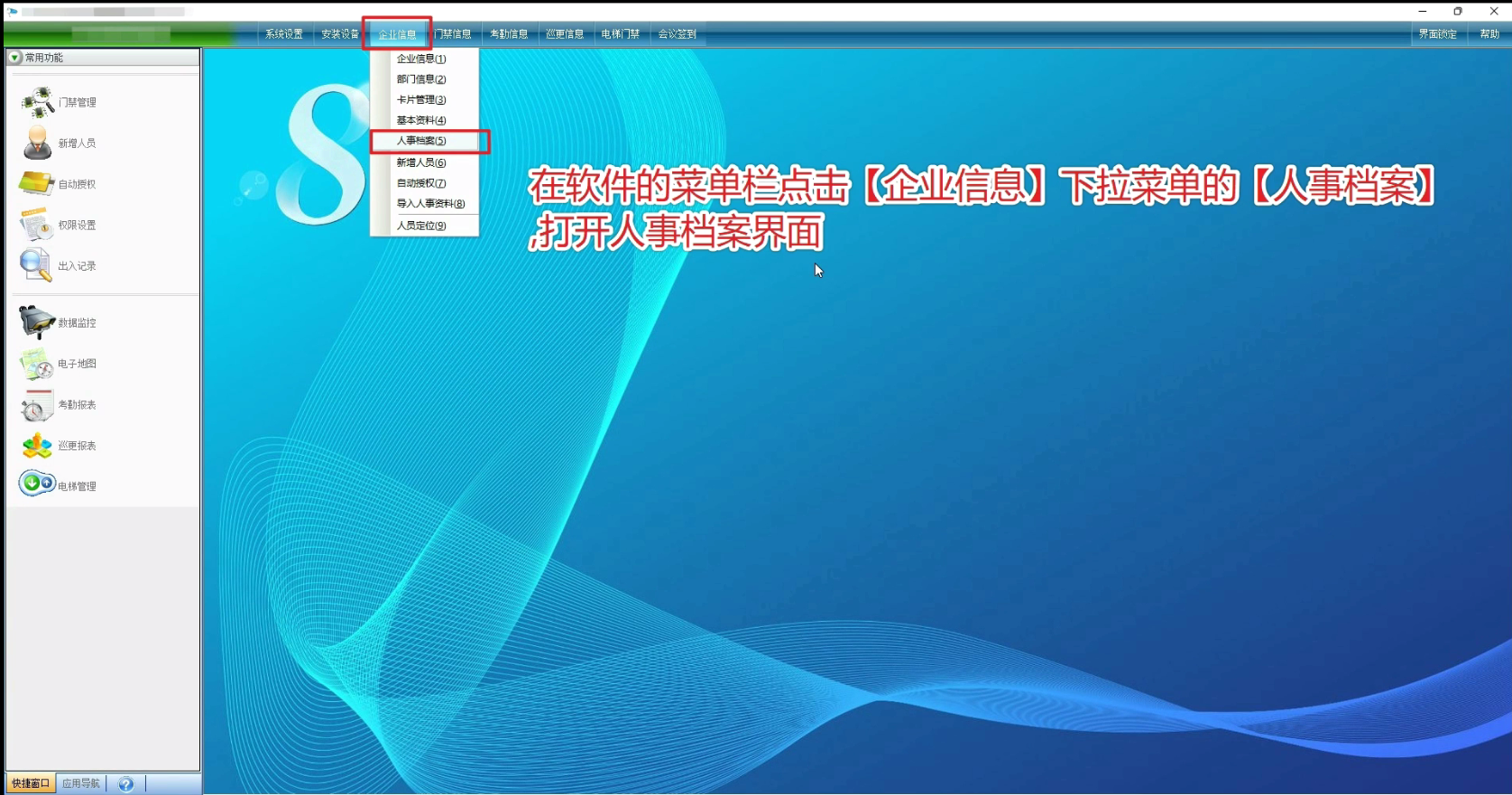在软件的菜单栏点击【企业信息】下拉菜单的【人事档案】,打开人事档案界面