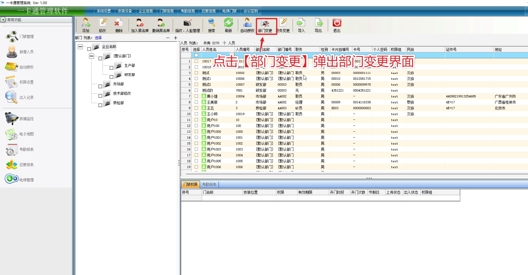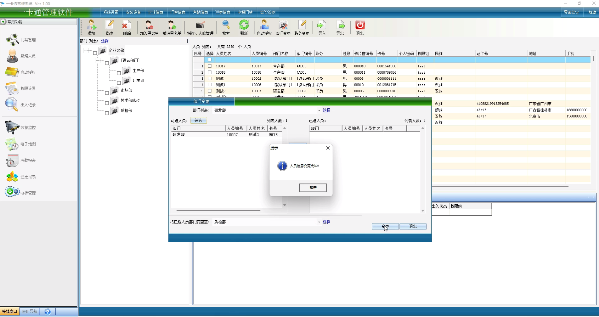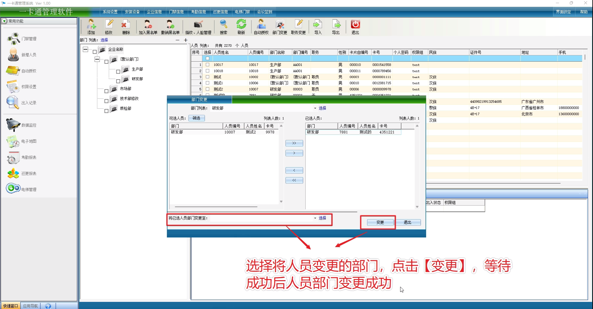 选择将人员变更的部门,点击【变更】,等待成功后人员部门变更成功
