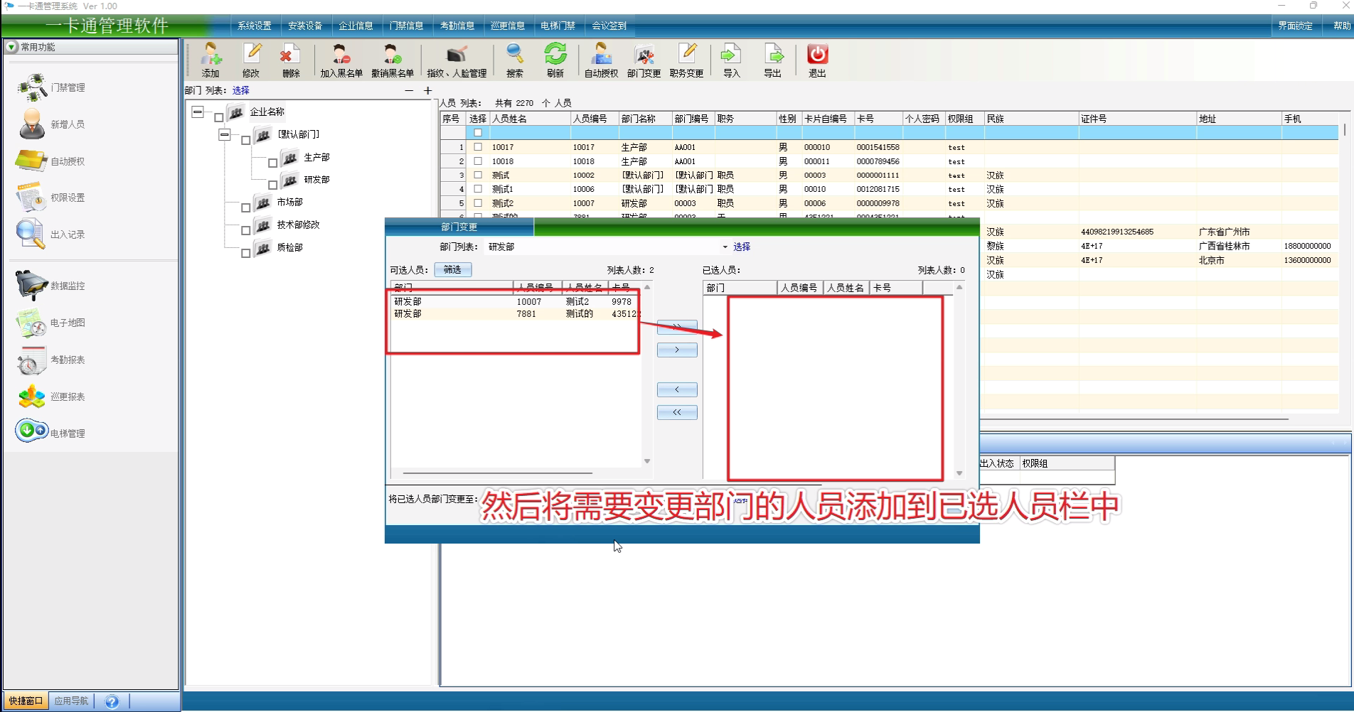 然后将需要变更部门的人员添加到已选人员栏中