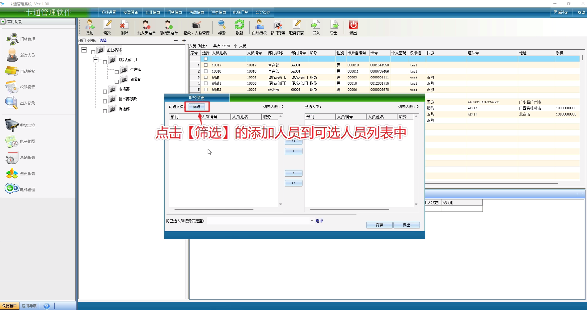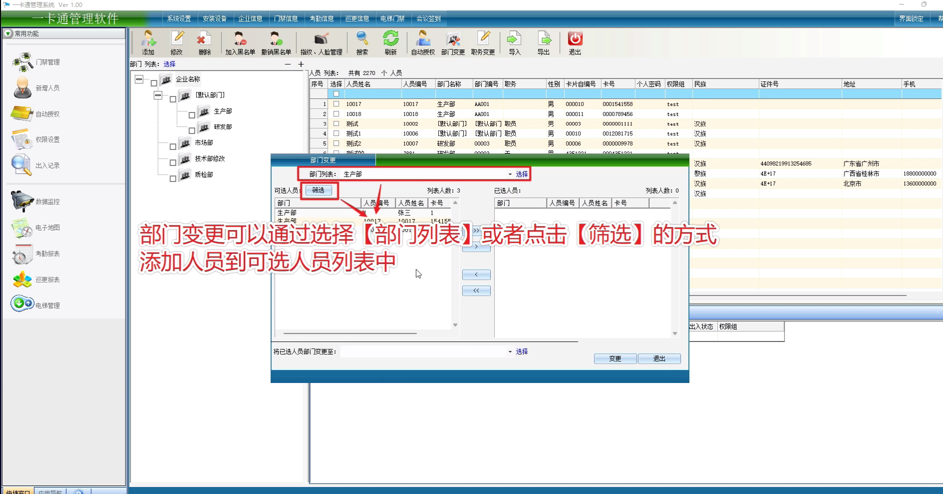 部门变更可以通过选择【部门列表】或者点击【筛选】的方式添加人员到可选人员列表中
