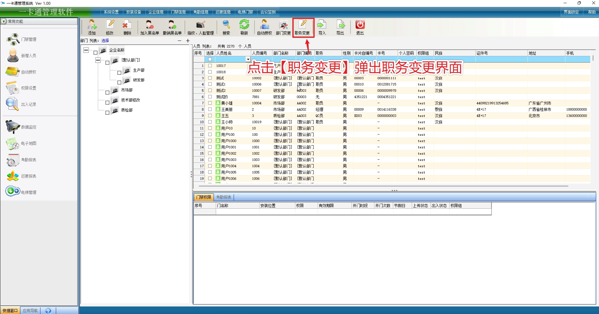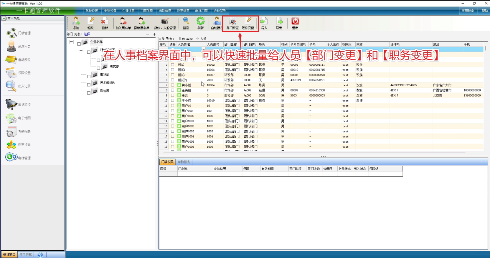在人事档案界面中,可以快速批量给大员【部门变更】和【职务变更】