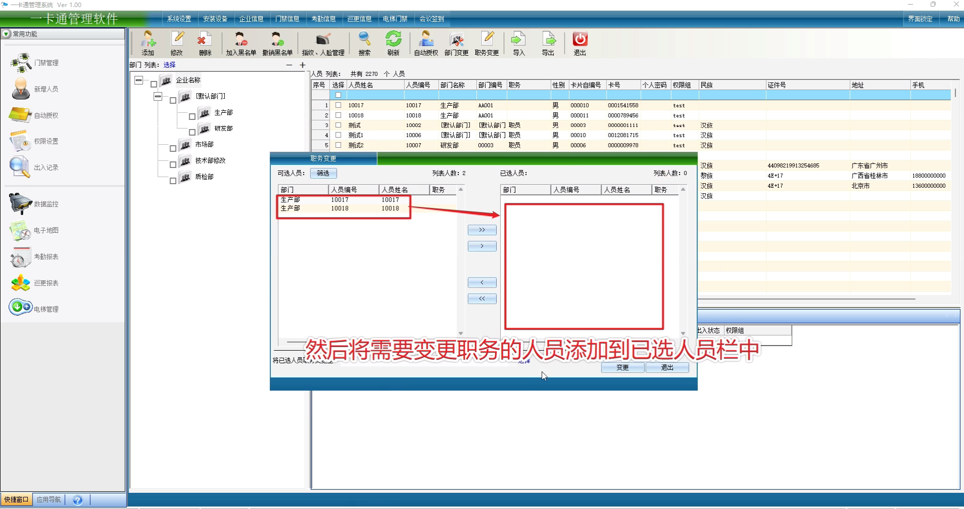然后将需要变更职务的大员添加到已选人员栏中