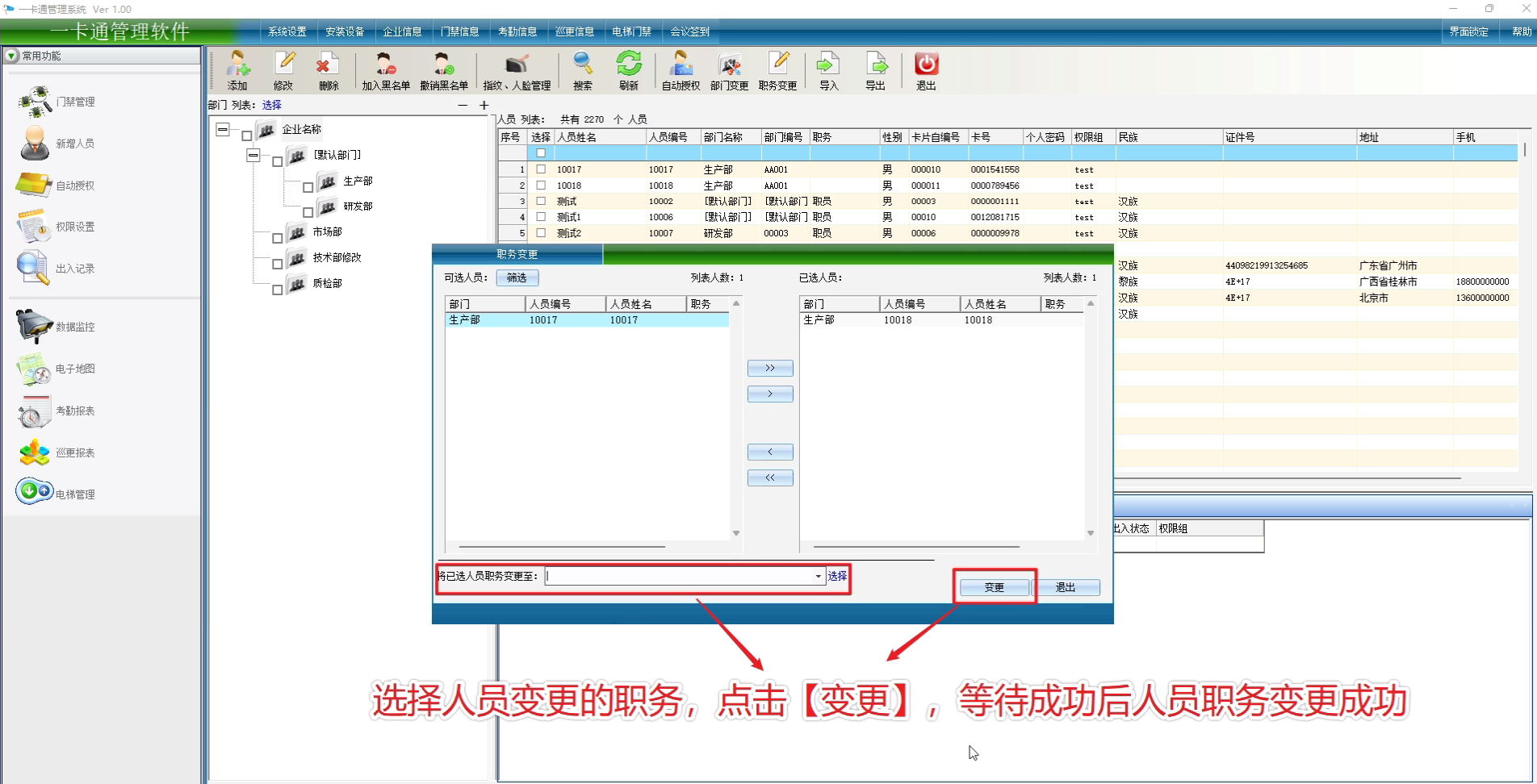 选择人员变更的职务,点击【变更】,等待成功后人员职务变更成功