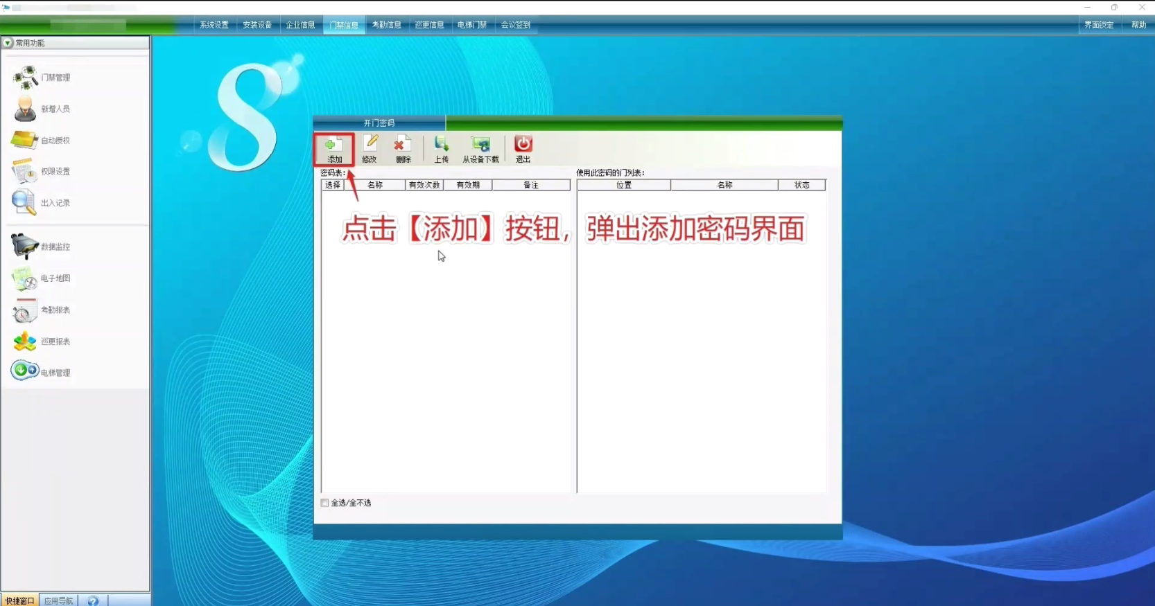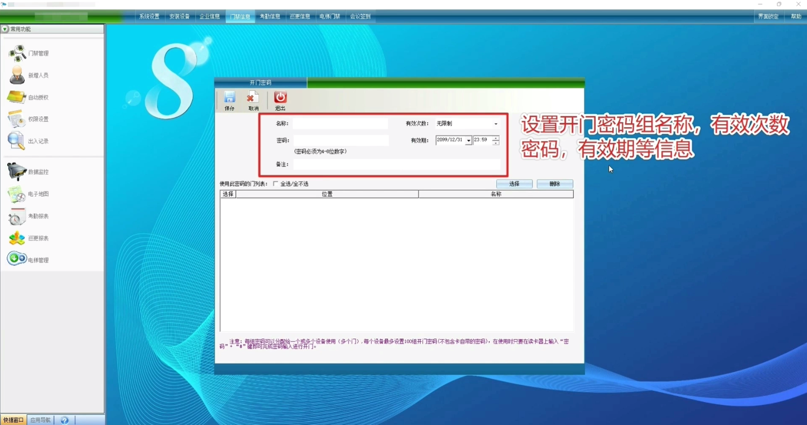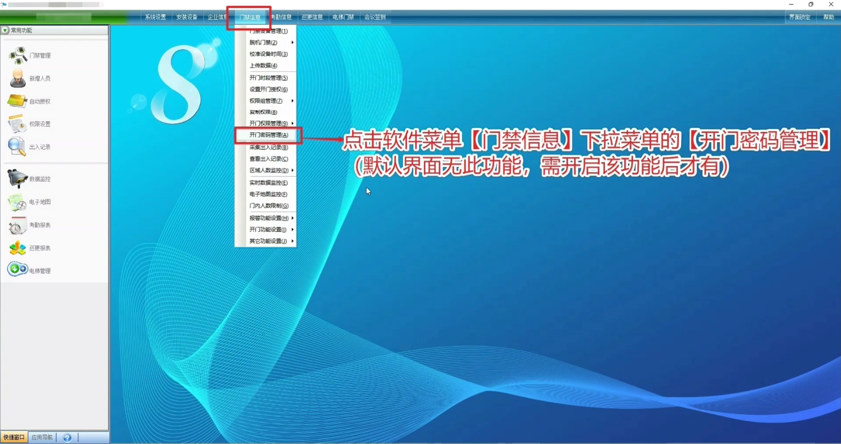 点击软件菜单【门禁信息】下拉菜单的【开门密码管理】(默认界面无此功能。需开启该功能后才有)