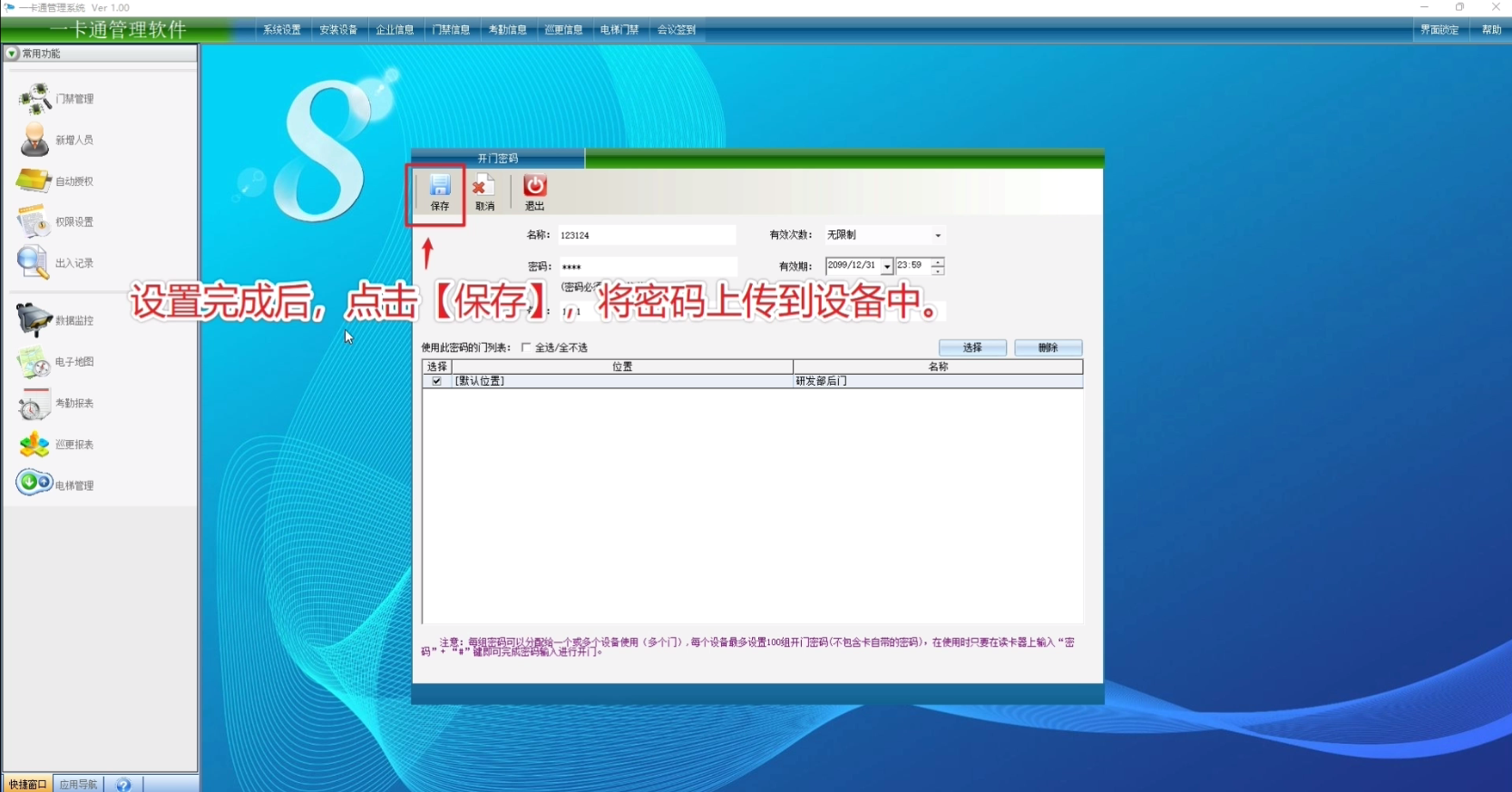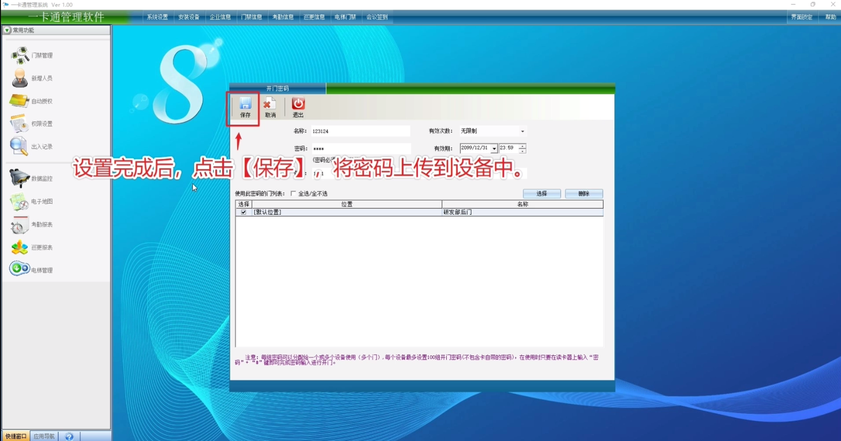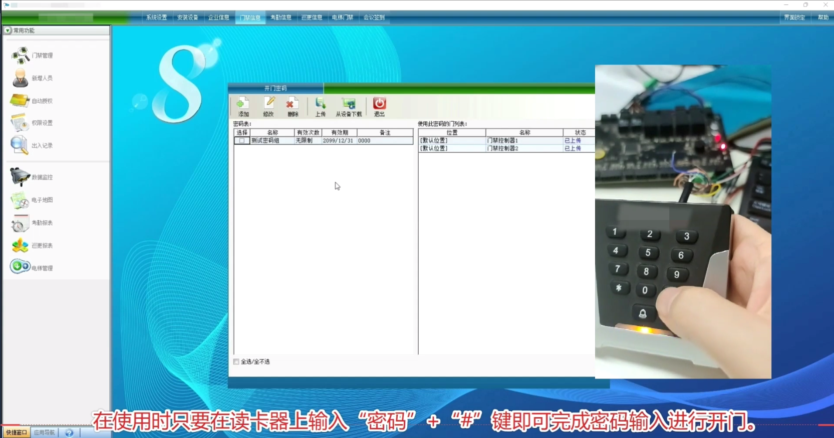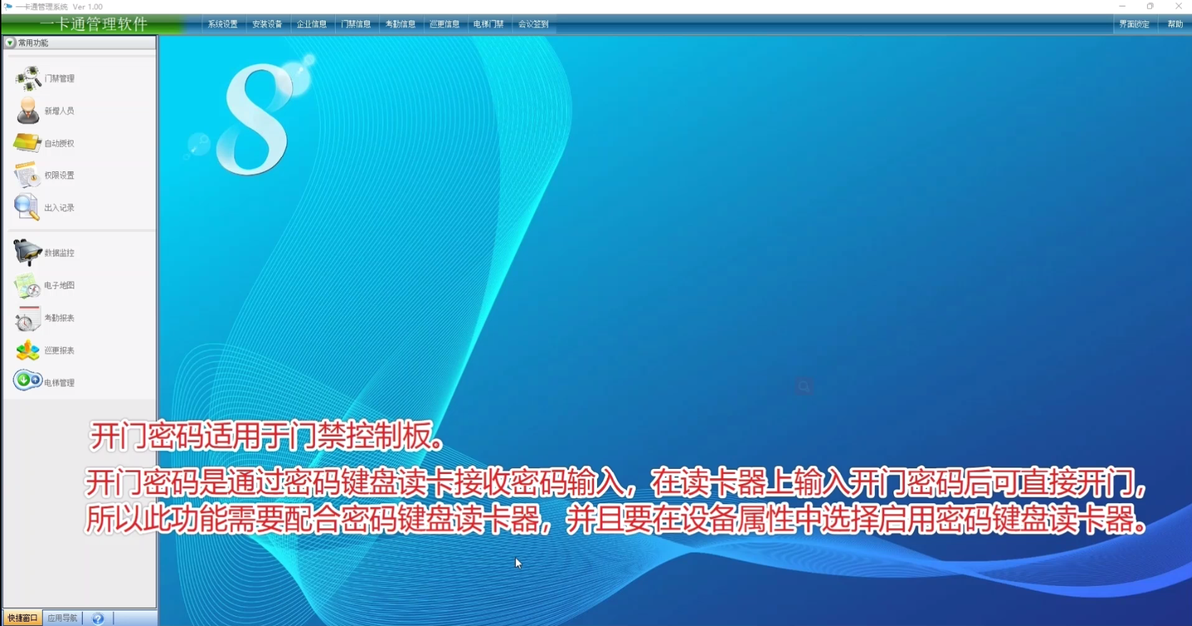 点击软件菜单【门禁信息】下拉菜单的【开门密码管理】(默认界面无此功能。需开启该功能后才有)