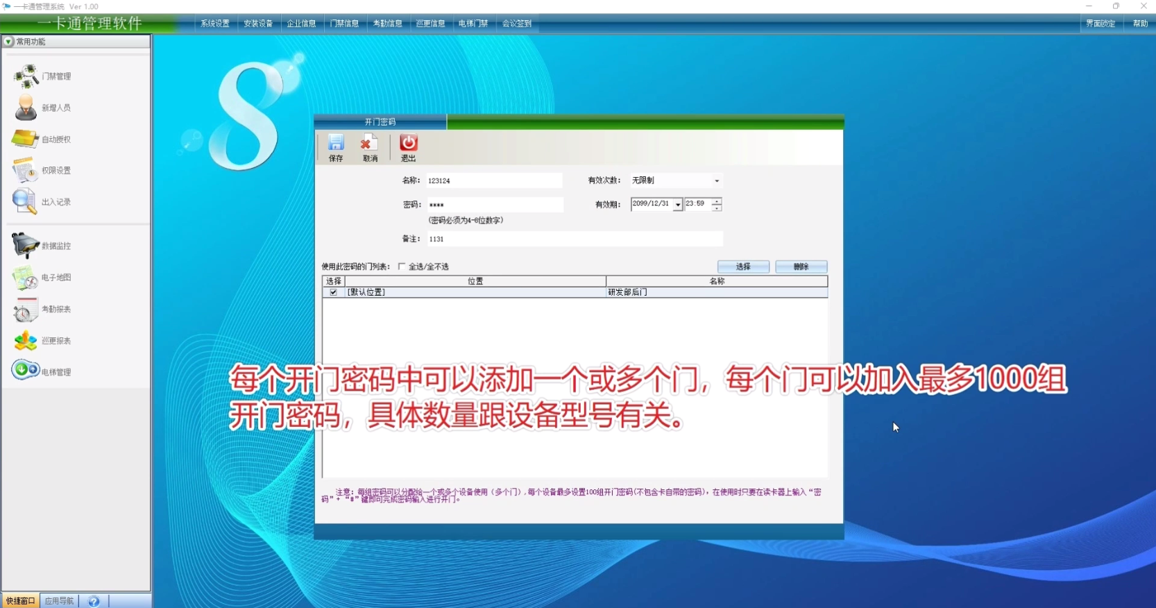 每个开门密码中可以添加一个或多个门,每个门可以加入最多1000组开门密码,具体数量跟设备型号有关。