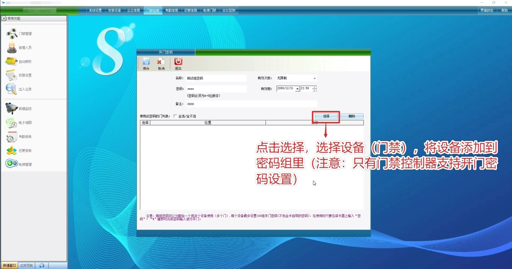 点击选择,选择设备(门禁),将设备添加到·密码组里(注意:只有门禁控制器支持开门密码设置)