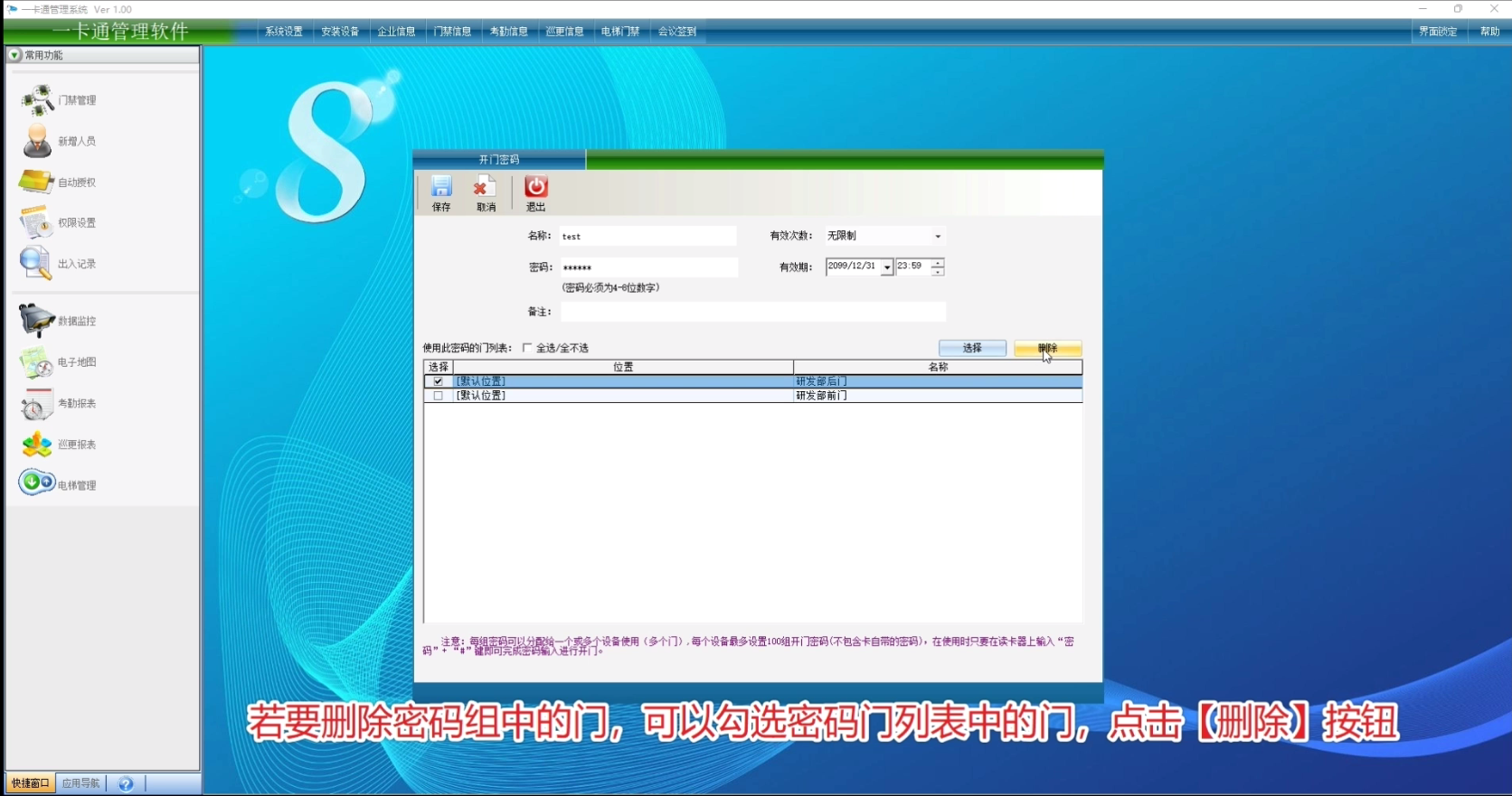 若要删除密码组中的门,可以勾选密码门列表中的门,点击【删除】按钮