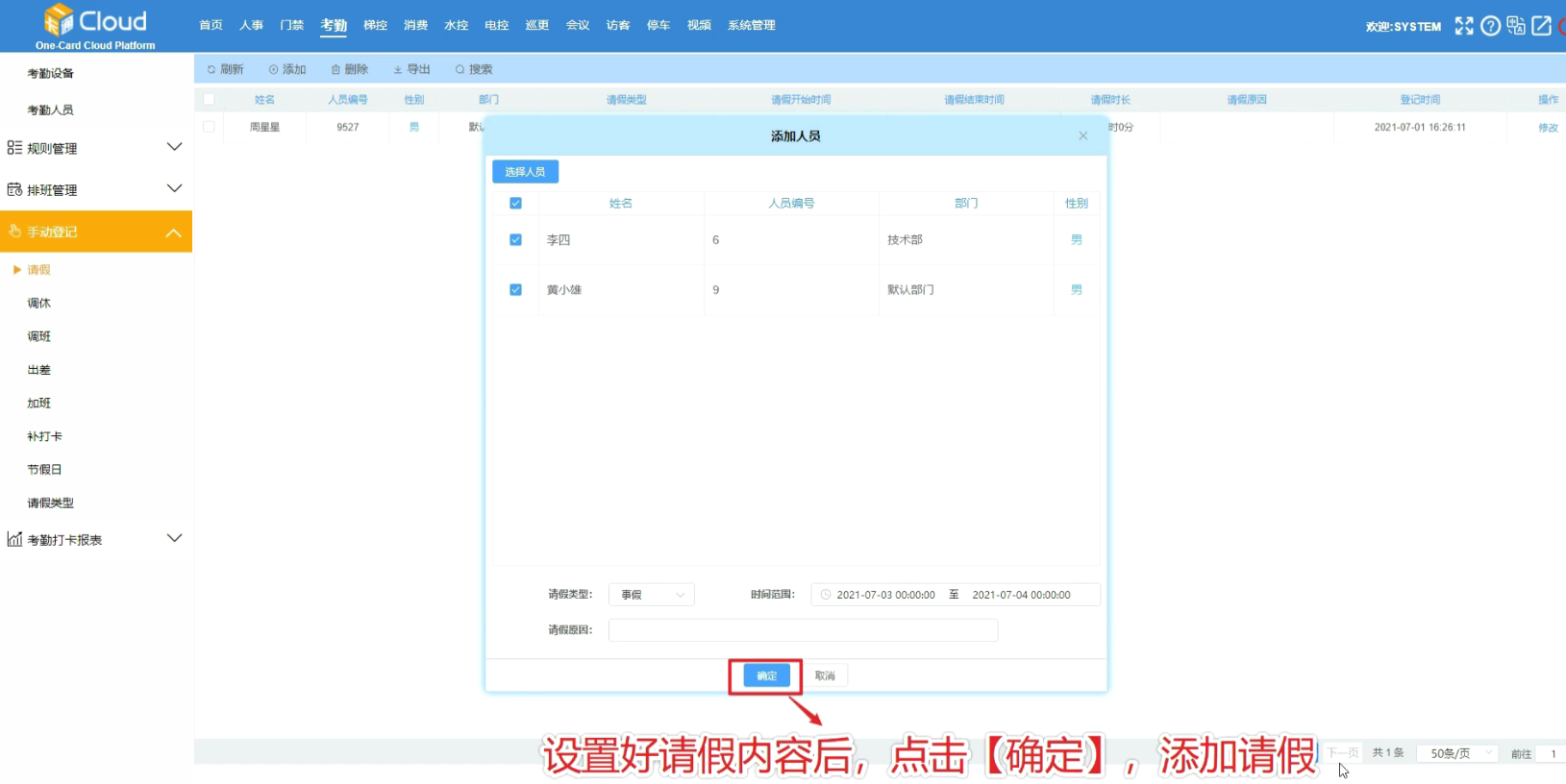 设置好请假内容后,点击【确定】 ,添加请假