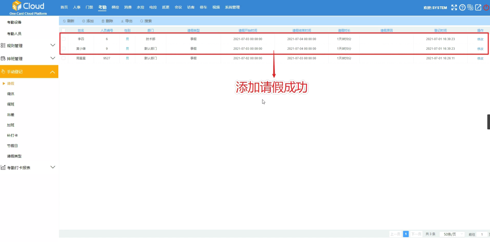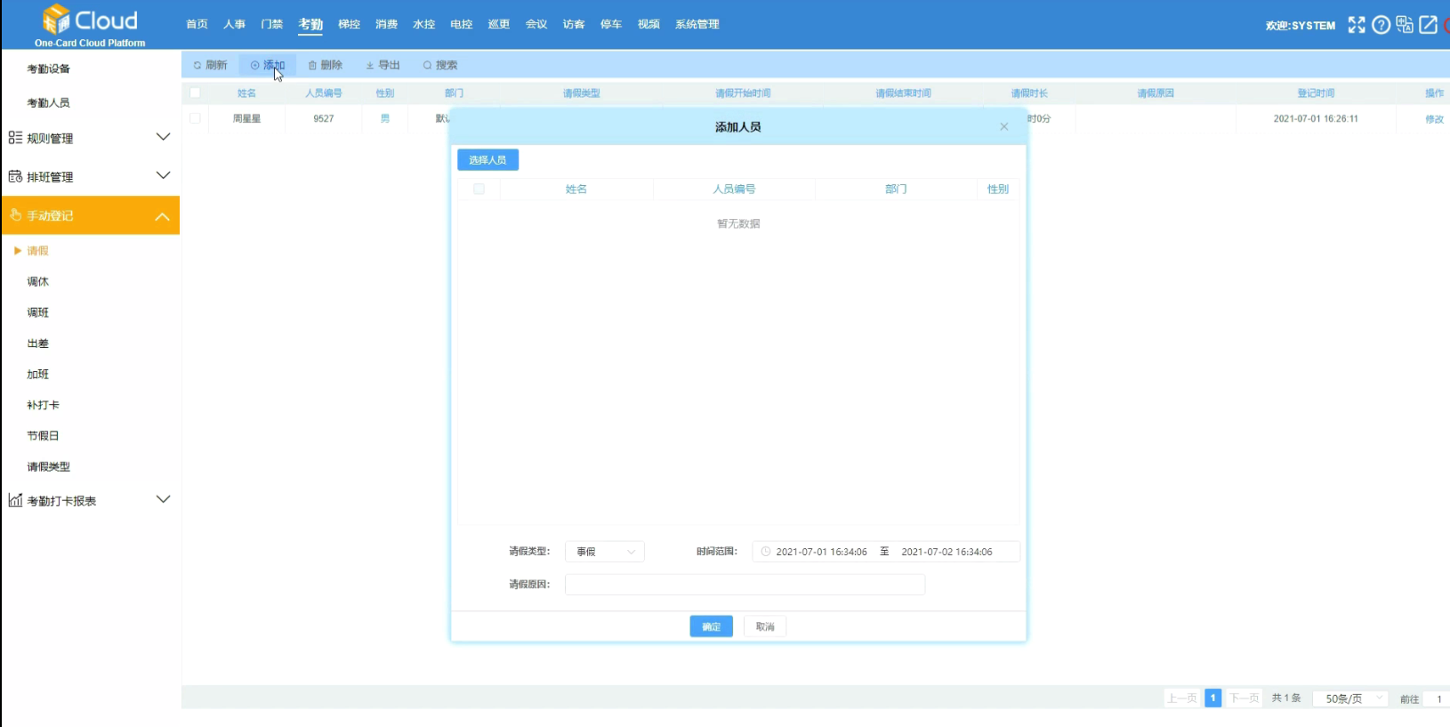 添加·修改·删除请假记录都需要在考勤报表中手动创建报表记录3. 点击【添加】按钮,弹出添加框