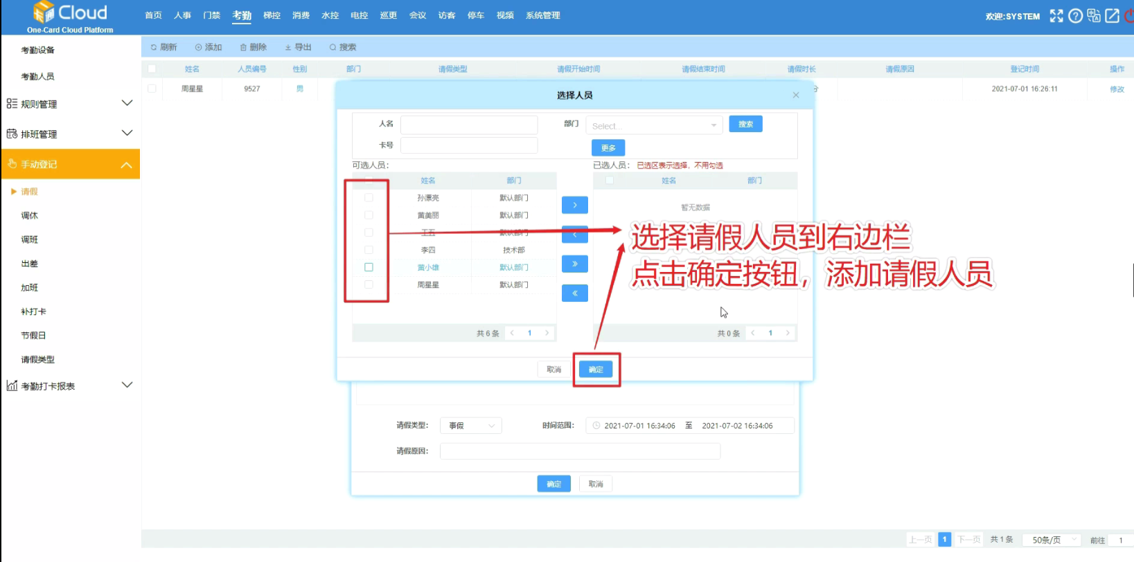 选择请假人员到右边栏点击确定按钮,添加请假人员