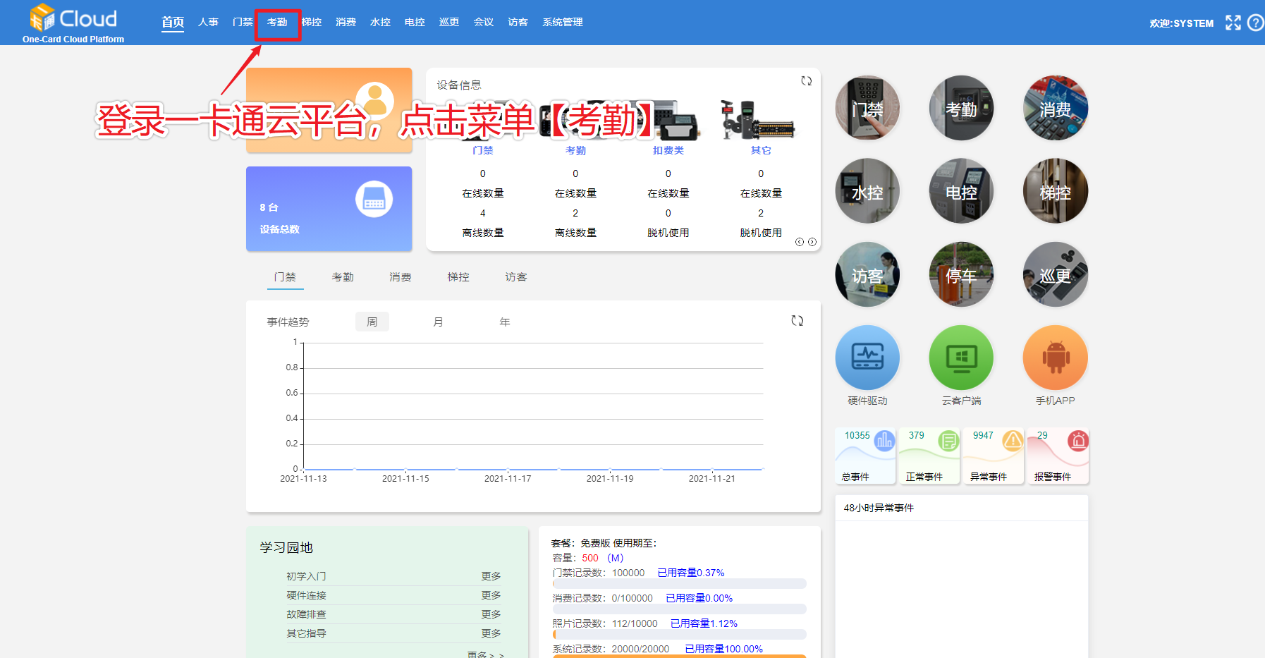登录一卡通云平台,点击菜单【考勤】