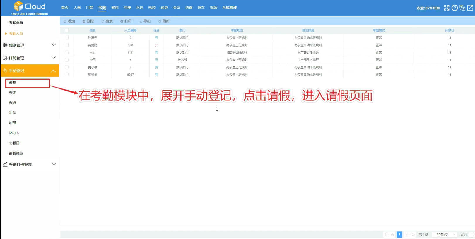 在考勤模块中,展开手动登记,点击请假,进入请假页面