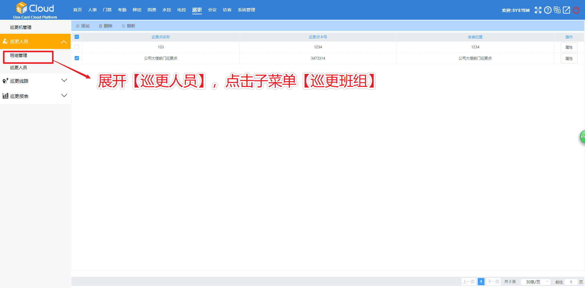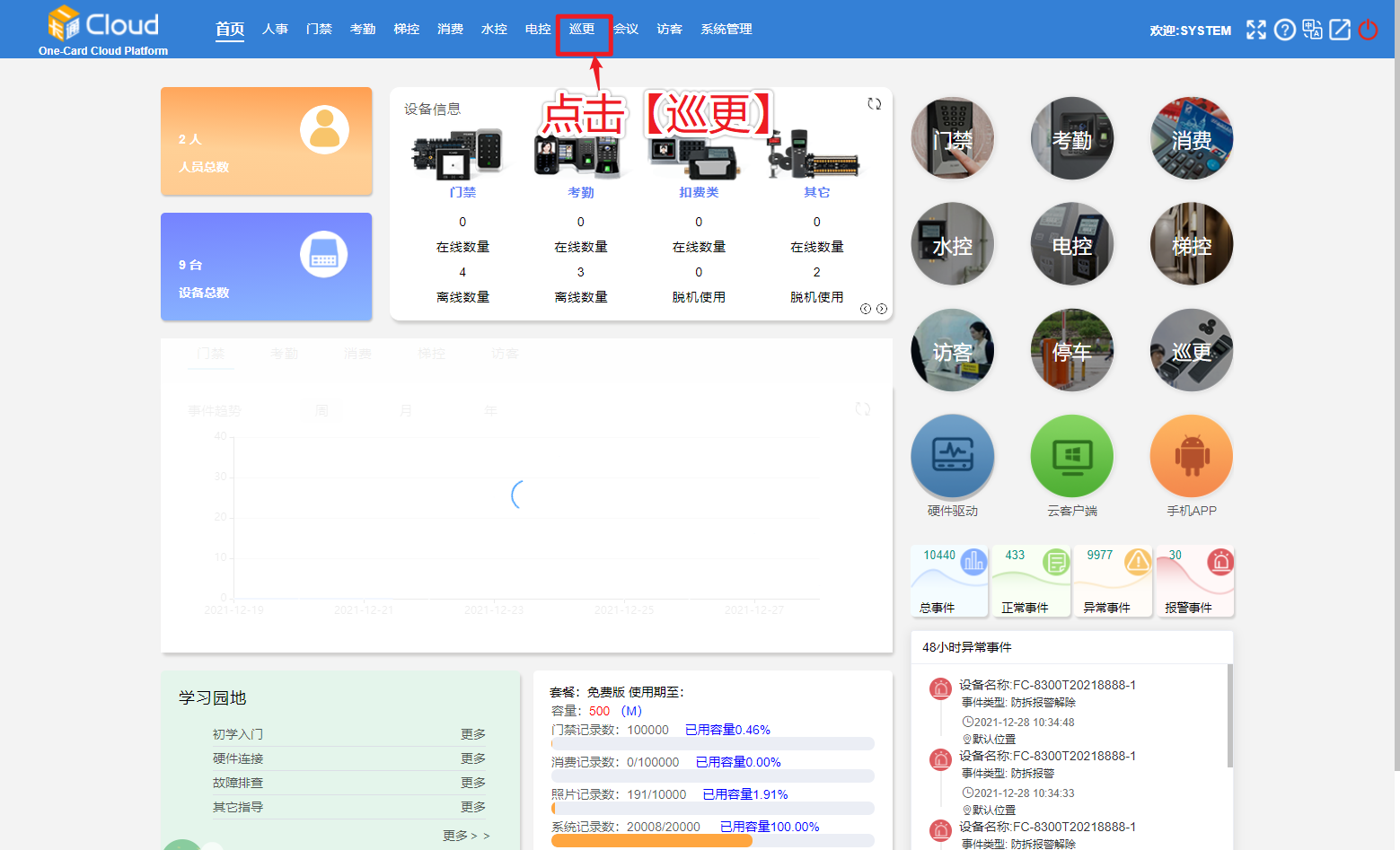 登录一卡通云管理平台,点击顶部菜单【巡更】