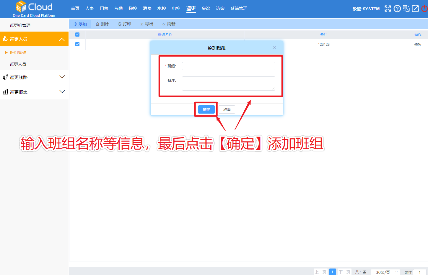 在巡更模块中,展开巡更人员,点击子菜单【巡更班组】,进入巡更班组页面